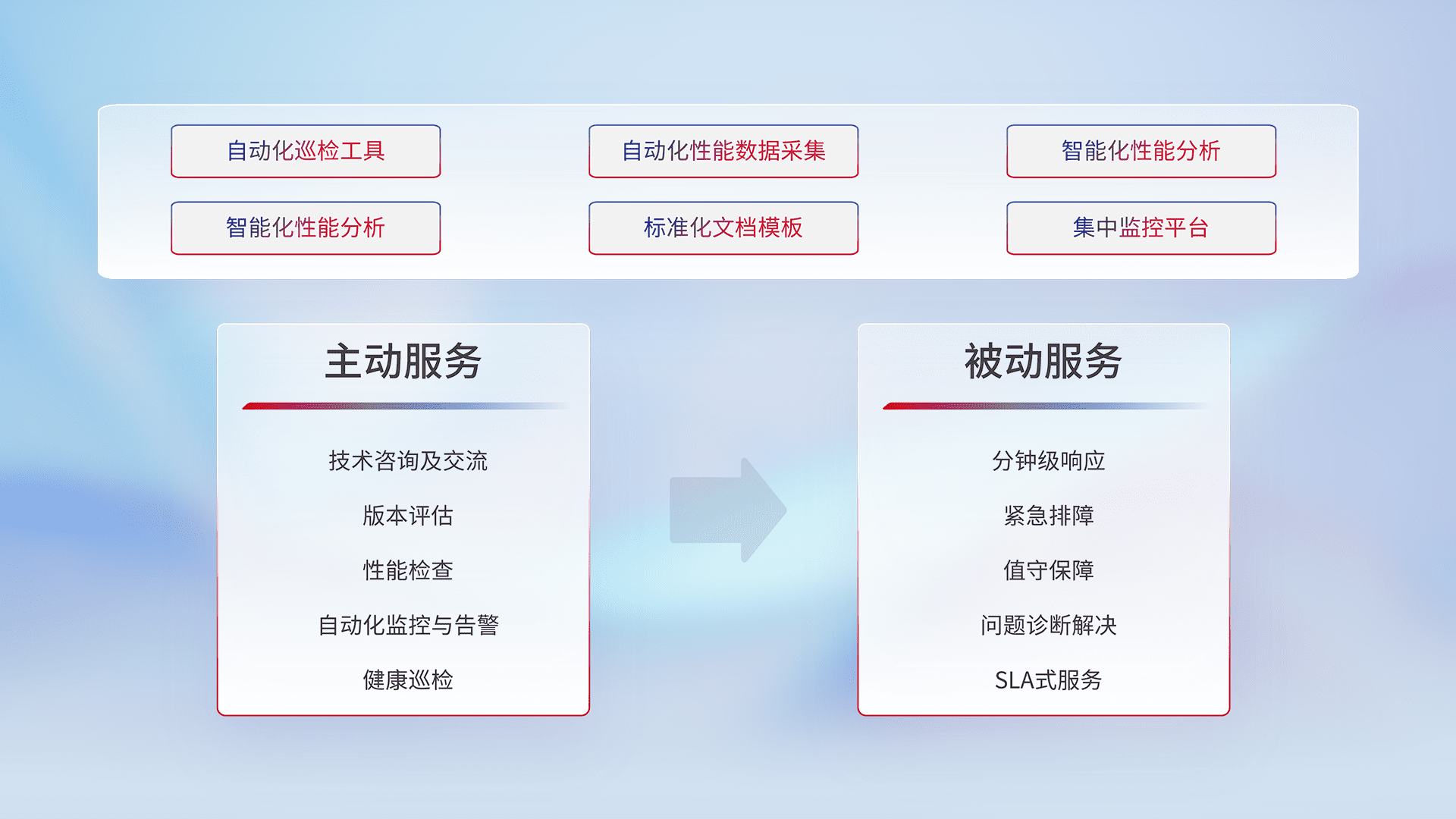 智能化工具和标准化文档,,保障服务质量,,,提供主动服务(包含技术咨询、、、、版本评估、、、性能检查、、自动化监控与告警、、健康巡检)和被动服务包含(分钟级响应、、、紧急排障、、值守保障、、、问题诊断解决、、、SLA服务)。。
