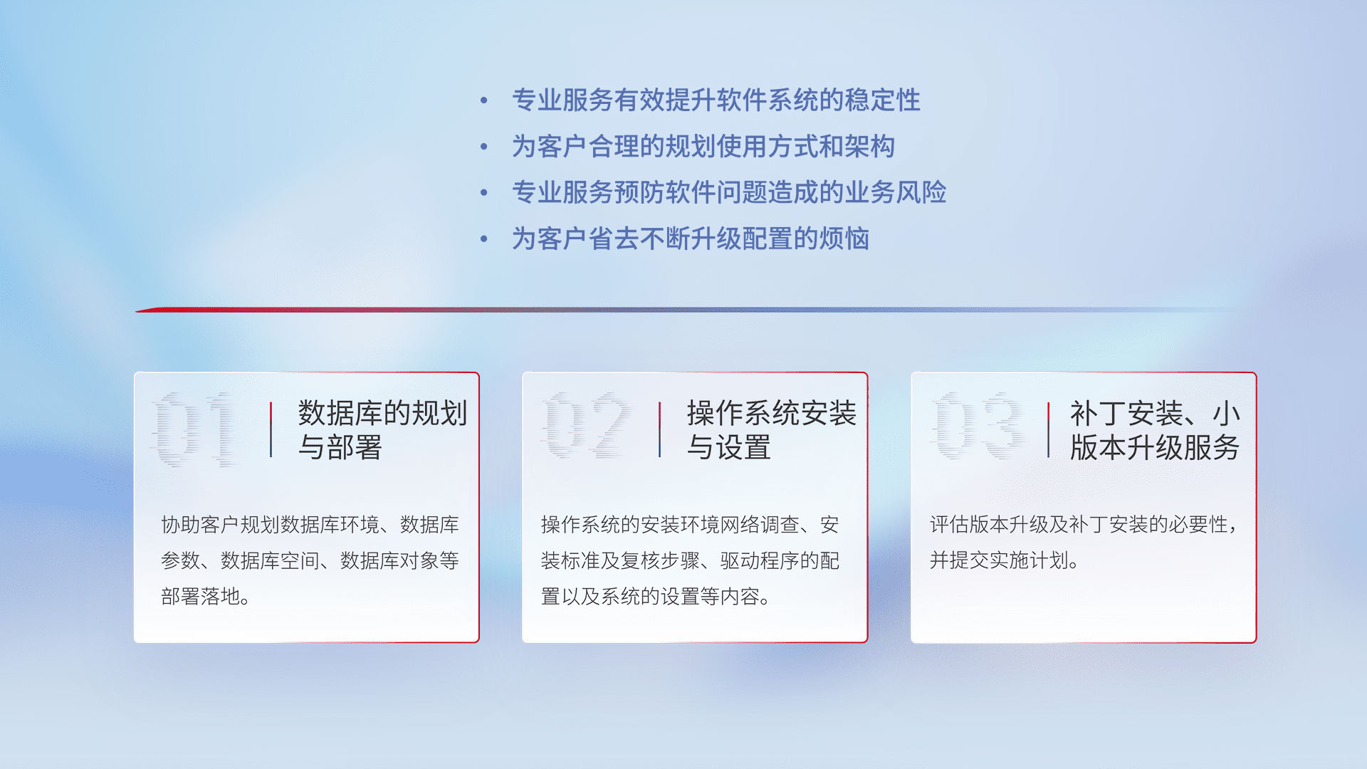 为客户提供软件规模升级、、、、快速部署、、按需配置的专业服务,,,从数据库的规划与部署到操作系统的安装与设置,,,,再到补丁安装和小版本升级提供支持。。。。